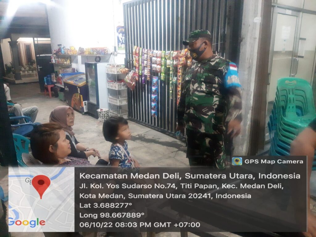 Medan Deli – Anggota Koramil 0201 – 11/Medan Deli ,Sertu Bahudin dan Serda Nanang melaksanakan protokol kesehatan di Jalan Yos Sudarso km 12,5 kelurahan Titipapan Kecamatan Medan Deli, di mana lokasi tersebut banyak berkumpul Masyarakat, Senin (10/10/2022) .