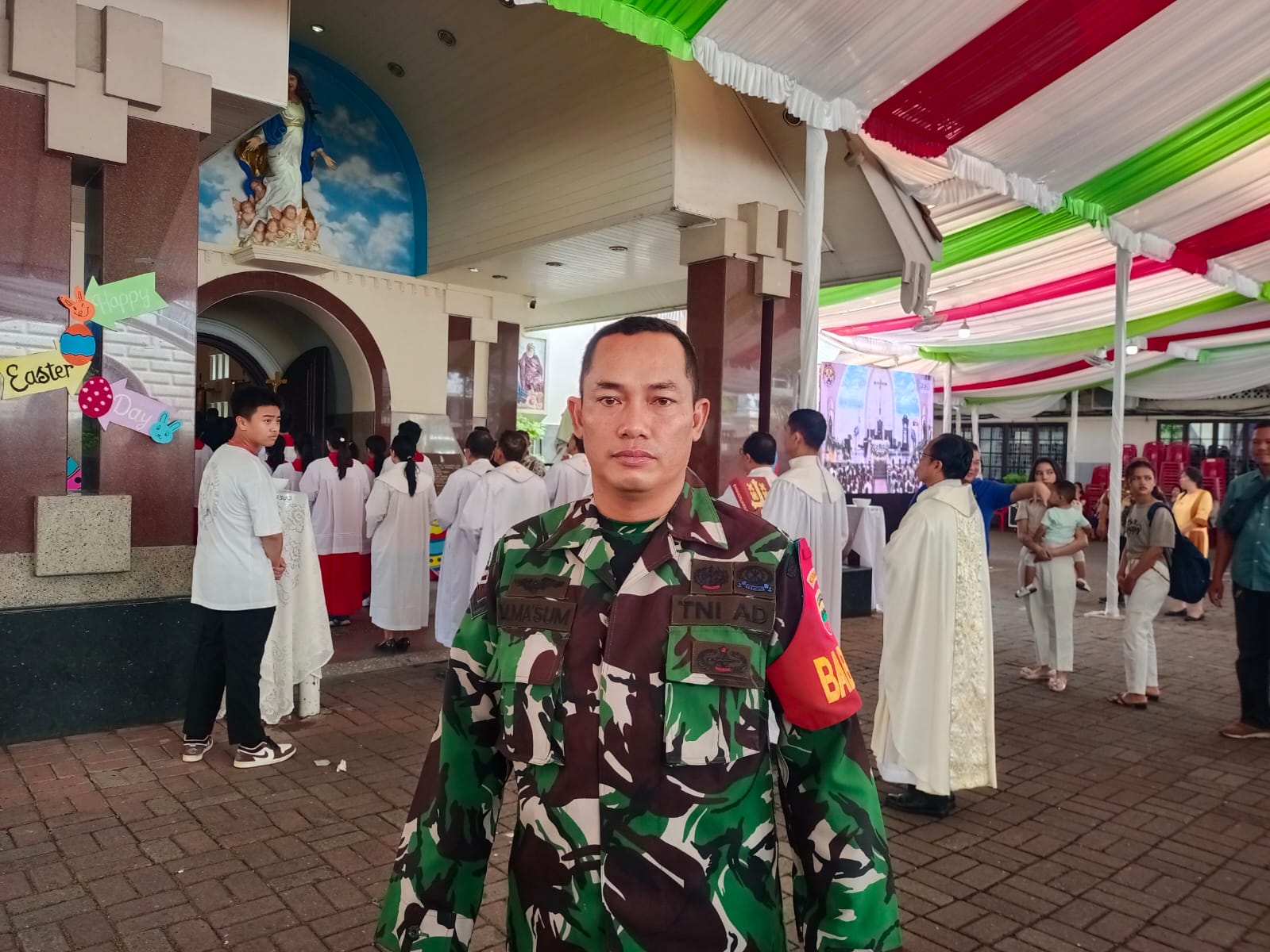 MEDAN 05/MB | Guna memberikan rasa aman dan nyaman bagi Umat Kristiani yang melaksanakan ibadah, Babinsa Koramil 0201-05/MB Kodim 0201/Medan Sertu M Maksum melaksanakan monitoring dan pengamanan jalannya ibadah Misa Paskah bertempat di Ibadah Misa Paskah dalam rangkaian kegiatan Paskah di Gereja Katholik Santa Perawan Maria Yang Dikandung Tanpa Noda Paroki Katedral Keuskupan Agung Medan Jl. Pemuda No. 1 Kelurahan Aur, Kecamatan Medan Maimun