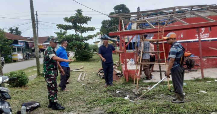 KLUMPANG kebun.Babinsa Koramil 0201-12/HP Serma Erita bersama masyarakat gotong royong memperbaiaki poskamling dan membersihkan rumput