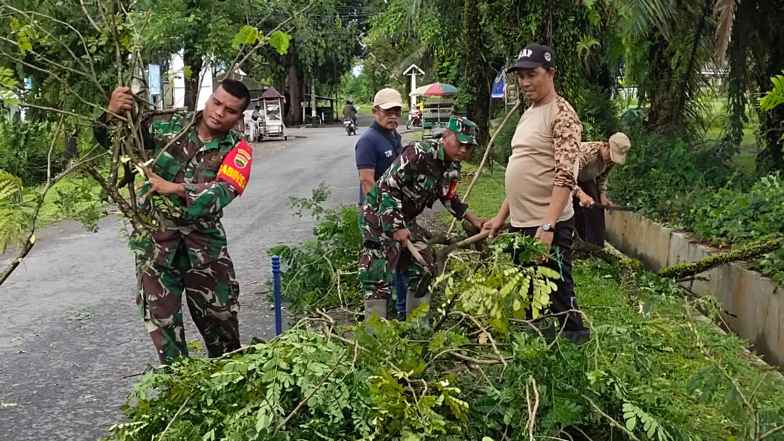 Babinsa Bergotong Royong Memotong Pohon Pinggir Jalan