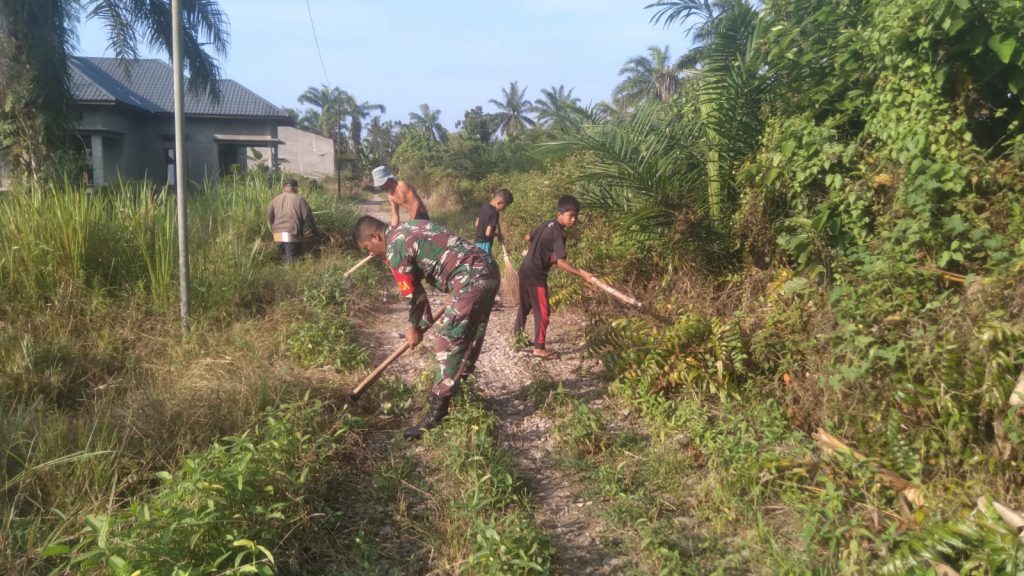 Babinsa Koramil 0201 12/Hamparan Perak Koptu Irwan Syahputra bersama warga masyarakat melaksanakan kegiatan membersihkan jalan di Desa Sei Baharu Kecamatan Hamparan Perak,Kabupaten Deliserdang,minggu(18/2/2024)