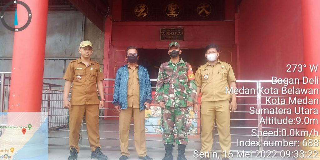 Babinsa Kelurahan Bagan Deli Koramil 0201-09/MB Kodim 0201/Medan Serka Suseno bersama Kepala Lingkungan melakukan pengamanan peringatan hari raya Trisuci Waisak Umat Budha di Wihara Thai Seng Tuah di Jalan Perikanan Gabion Kelurahan Bagan Deli Kecamatan Medan Belawan. Senin (16/05/2022).