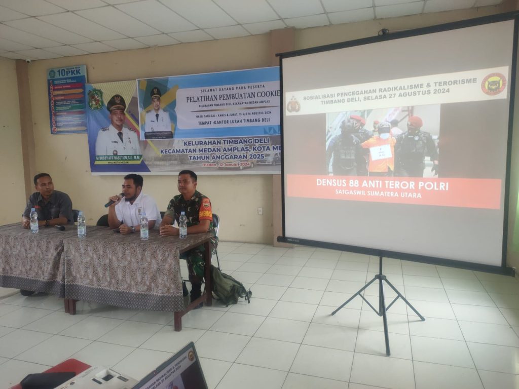 Babinsa Kel. Timbang Deli Serda Mariunus Zalukhu anggota dari Koramil 0201-08/MA menghadiri undangan sosialisasi pencegahan radikalisme dan terorisme yang di gelar oleh Sat Densus 88 anti teror Mabes Polri satgas wilayah Simatera Utara. Bertempat di Aula Kantor Lurah Timbang Deli, Jalan Balai Desa, Kecamatan Medan Amplas. Selasa (27/08/24).