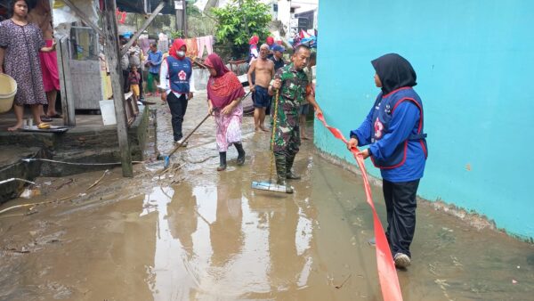 “Hari ini kami bersama warga bergotong royong melaksanakan pembersihan rumah warga dari sisa-sisa lumpur dan mengangkat barang-barang masyarakat yang basah akibat terendam air pasca banjir tadi malam.” tutur Babinsa.