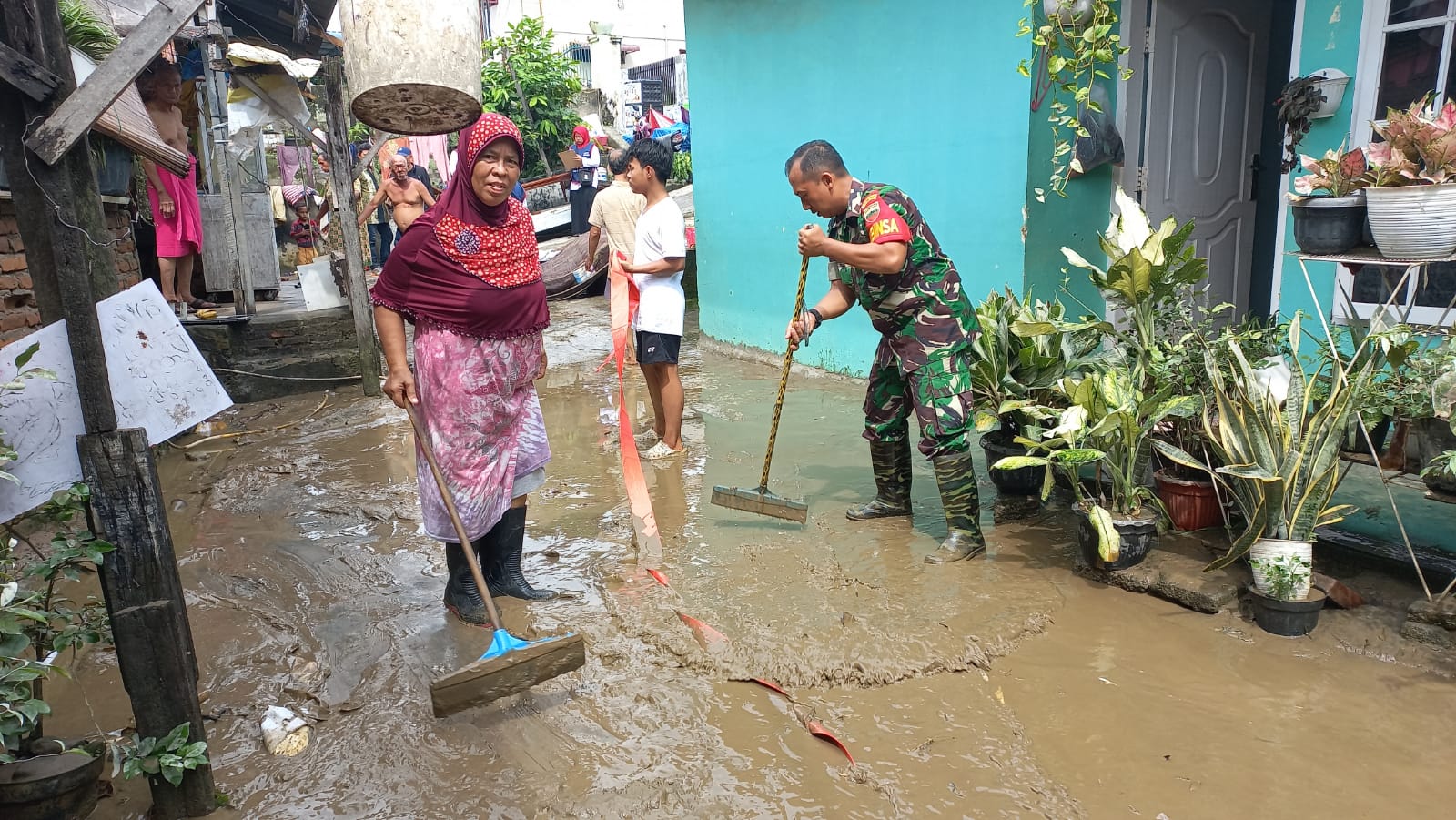 “Hari ini kami bersama warga bergotong royong melaksanakan pembersihan rumah warga dari sisa-sisa lumpur dan mengangkat barang-barang masyarakat yang basah akibat terendam air pasca banjir tadi malam.” tutur Babinsa.