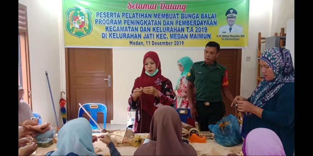 Babinsa Koramil 05/MB Kodim 0201/BS Sidorejo Serka Danial Ginting melaksanakan Komunikasi Sosial (Komsos) dengan ibu-ibu PKK dari Kelurahan Jati dalam rangka pelatihan kerajinan tangan membuat bunga tangan di aula kantor Lurah Jati Kecamatan Medan Maimun, Rabu (11/12/2019).