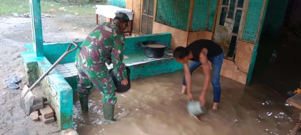 “Hari ini kami membantu warga bergotong royong melaksanakan pembersihan rumah warga dan mengangkat barang-barang masyarakat yang basah akibat terendam air”, tutur Babinsa.