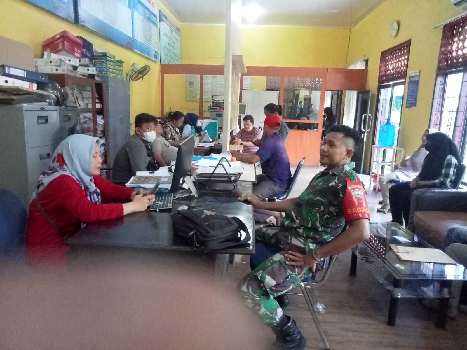 Selain itu juga,Babinsa Serda M.Panjaitan menyempatkan waktunya untuk menyapa dan berbincang bincang dengan warga yang sedang membuat surat dari kelurahan untuk pengurusan beasiswa anaknya di sekolah