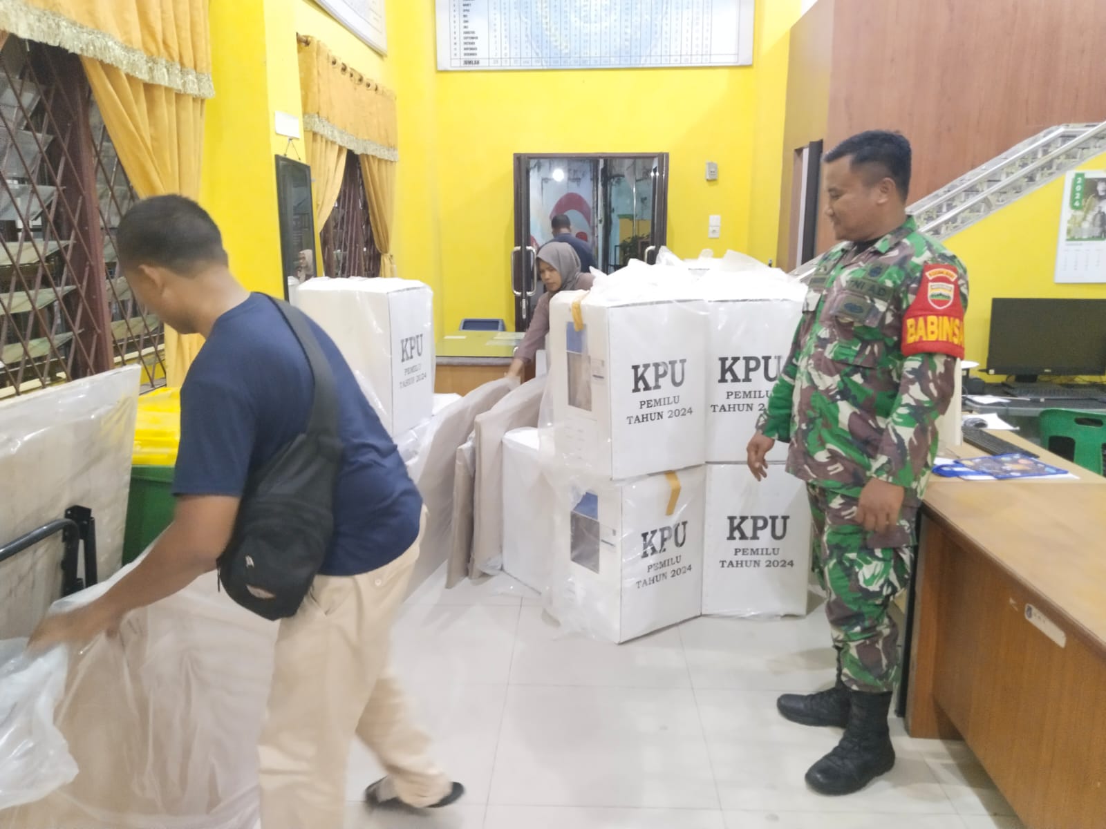 MEDAN 05/MB | Bertempat di Kantor Lurah Kelurahan Polonia, Babinsa Koramil 0201-05/MB Sertu Ach Taufik bersama Bhabinkamtibmas Aiptu Dirson memonitor pendistribusian logistik Pemilu 2024.