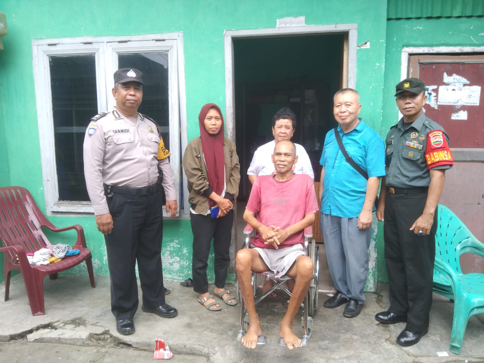 Komandan Koramil 0201-01/Medan Petisah Kapten Inf Sabur Utomo mendelegasikan kepada Babinsa nya untuk turun langsung secara simbolis untuk menyambangi warga binaan nya yang menerima bantuan kursi roda kepada warga yang membutuhkan nya.