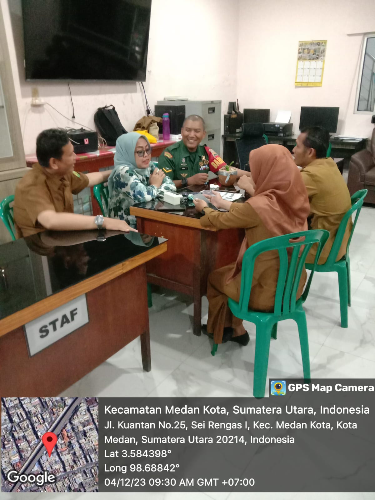Medan Kota- Babinsa Koramil 0201/04/MK Serda Candra H melaksanakan Komsos(Komunikasi Sosial) dan silaturrahmi dengan perangkat kelurahan & Kepling. Senin (12/04/2023)