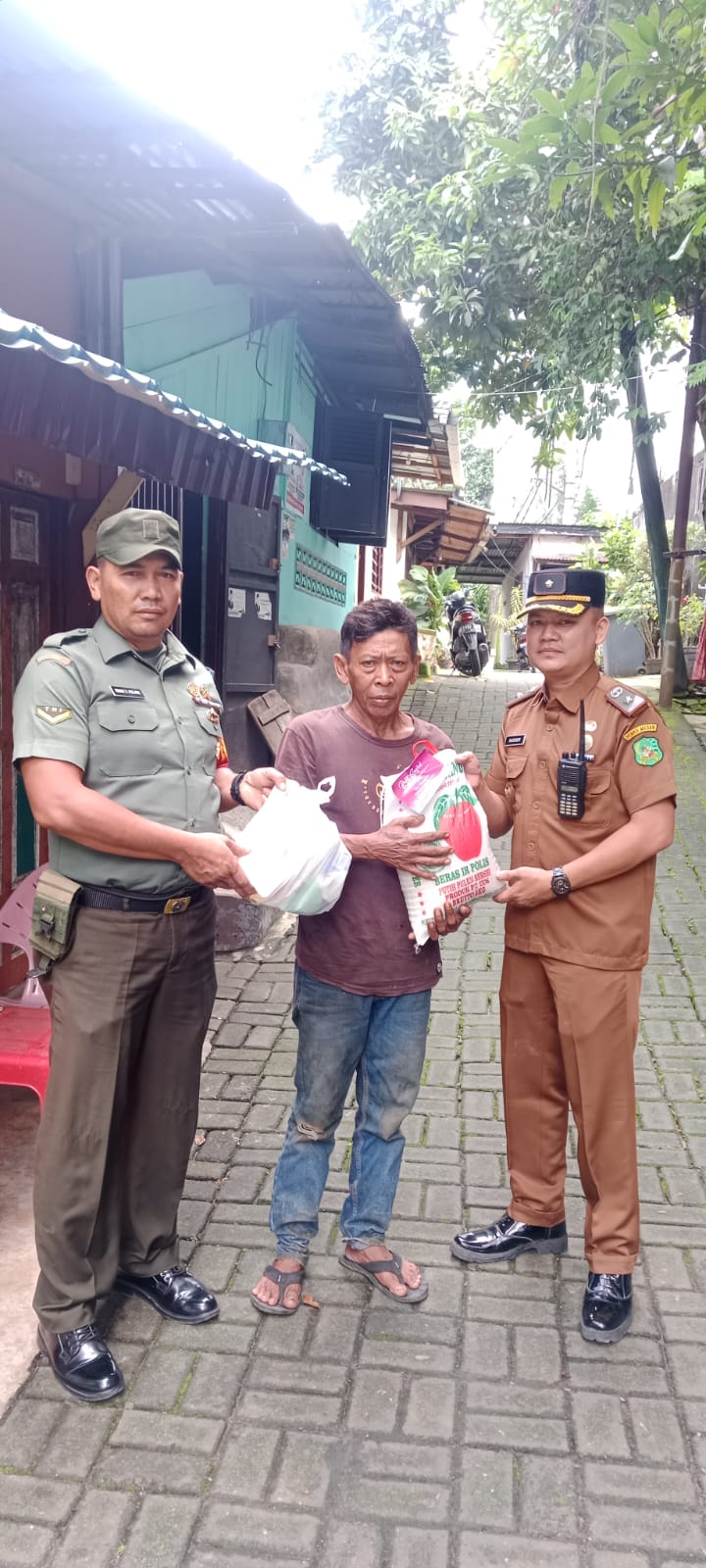 MEDAN 05/MB | Babinsa Koramil 0201-05/MB, Kodim 0201/Medan Serda R Pelawi Sembiring membantu menyalurkan bantuan paket sembako kepada warga Kelurahan Jati, Kecamatan Medan Maimun.