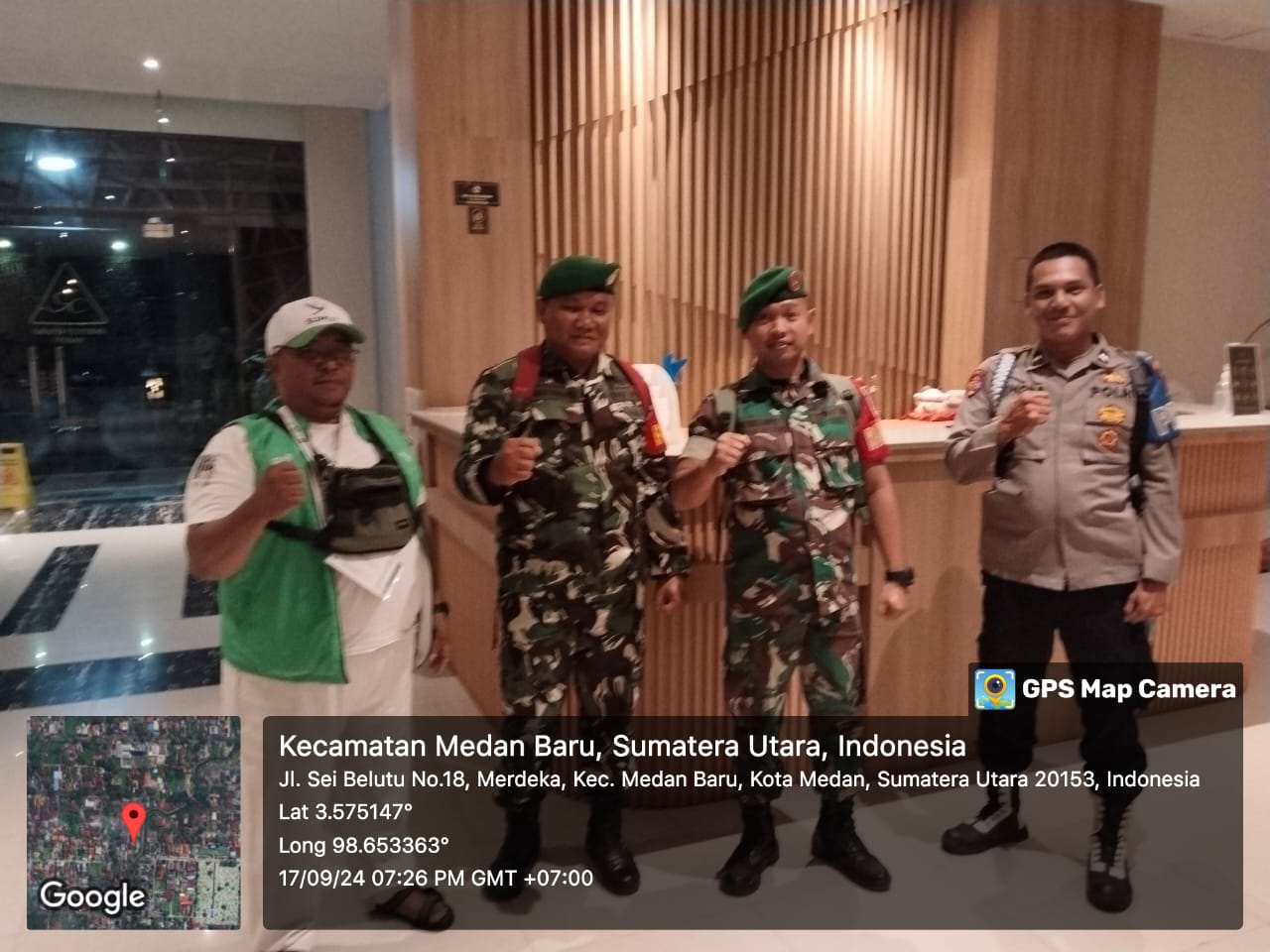MEDAN | Babinsa Koramil 0201-05/MB Serda Adri dan Serda Doni melaksanakan pengamanan bersama personel dari Polsek Medan Baru guna memastikan kelancaran dan keamanan selama atlet PON XXI menginap di Hotel Grand Central Jl. Sei Belutu, Kel. Merdeka, Kec. Medan Baru, Medan.