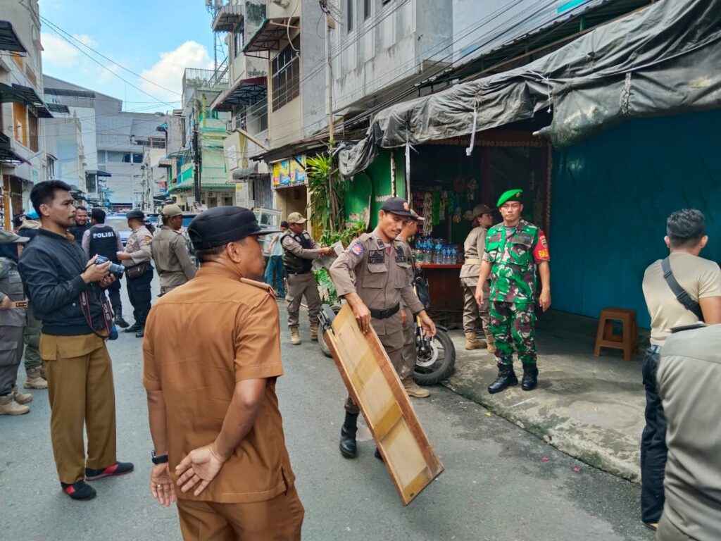 MEDAN 05/MB | Babinsa Koramil 0201-05/MB Kodim 0201/Medan Sertu Ach Taufik dan Sertu M Maksum melaksanakan pendampingan penertiban pedagang kaki lima (PK-5), Plang toko, dan bangunan liar yang berdiri di atas trotoar dan drainase di wilayah Kelurahan Madras Hulu, Kecamatan Medan Polonia.