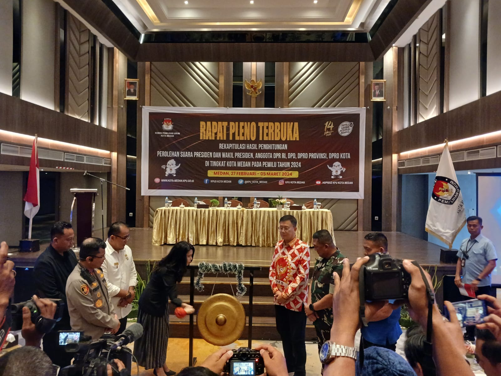 Pukul 11.55 WIB Acara Pembukaan Rapat Pleno Terbuka Rekapitulasi Hasil Penghitungan Perolehan Suara Presiden Dan Wakil Presiden Anggota DPR RI, DPD, DPRD Provinsi, DPRD Kota di Tingkat Kota Medan Pada Pemilu Tahun 2024 selesai di laksanakan dalam keadaan aman dan lancar.(05/MB)