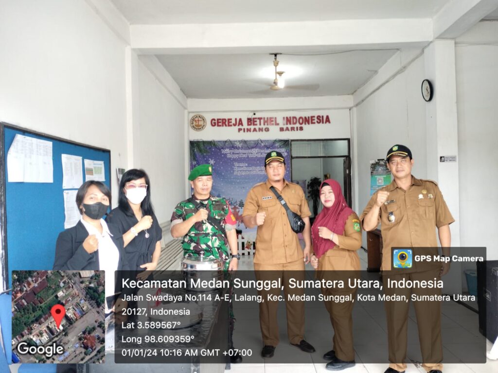 Medan.Babinsa Koramil 0201-06/MS Kodim 0201/Medan Sertu Suardi bersama Bhabinkamtibmas dan Aparatur Kelurahan Setempat bersinergi mengamankan perayaan ibadah Kebaktian diawal Tahun Baru 2024 Bertempat Gereja GBI, Jalan Swadaya Link VI Kelurahan Lalang Kecamatan Medan Sunggal, Senin (01/01/24)