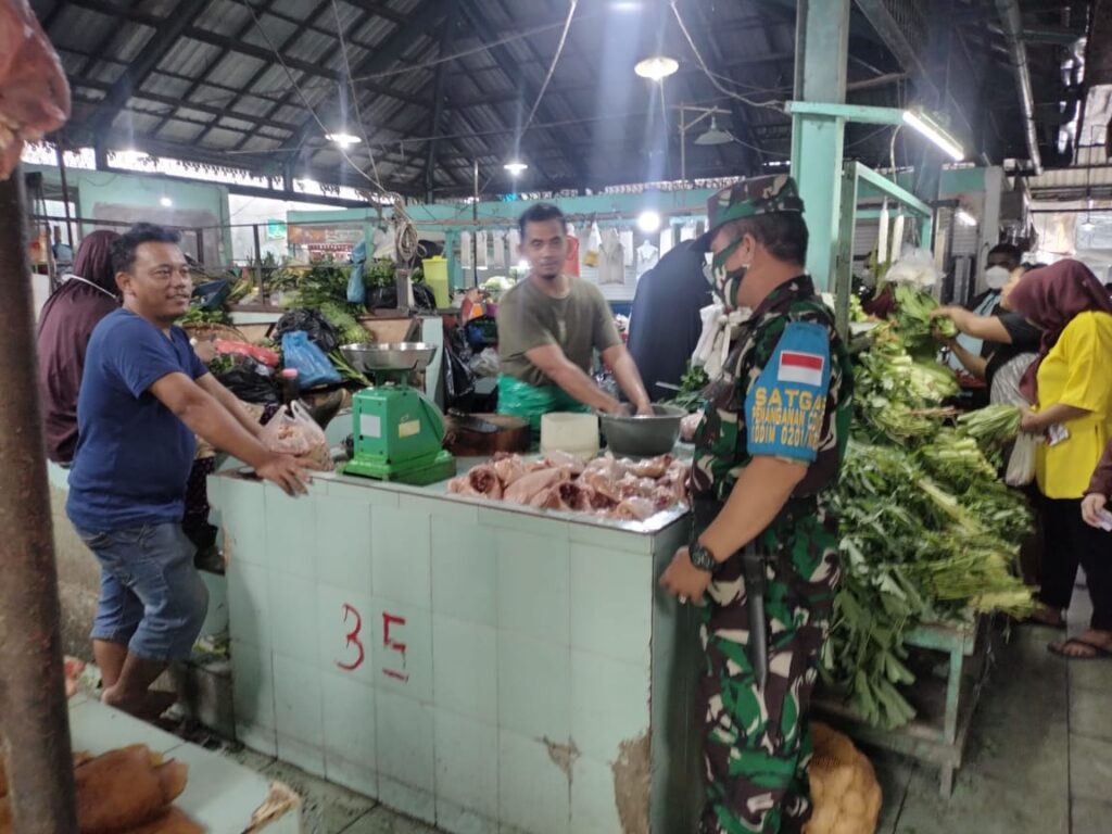 Babinsa mengharapkan agar para pembeli dan penjual yang berada di Pasar Benar benar Terapkan dan patuhi Prokes Covid 19 Jaga Kesehatan,Kebersihan