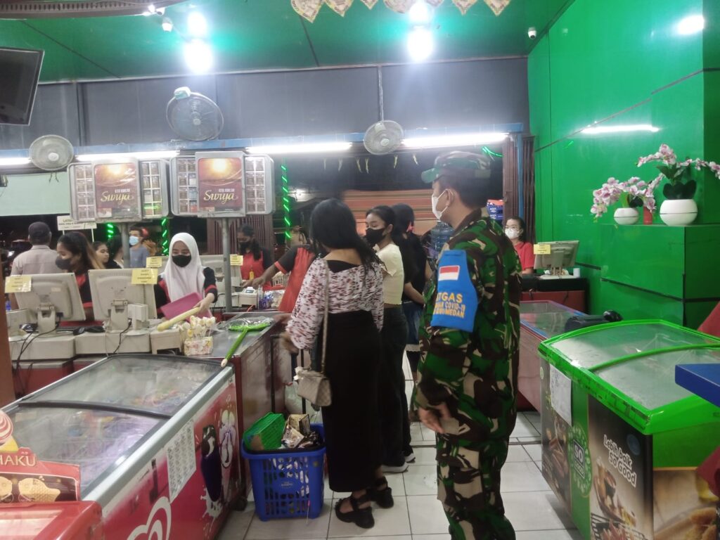 Medan Sunggal,Babinsa Koramil 0201-06/MS Sertu Udin Guntoro Terus Himbau Prokes Kepada Masyarakat Khususnya Pengunjung/Pembeli Terapkan Prokes Guna untuk Mencegah penyebaran Virus Covid-19 diwilayah Sunggal Khususnya dimana Malam ini warga masyarakat banyak Berkunjung/Berbelanja Untu Kebutuhan Pribadi Jl.TB.Simatupang Lk.IV Kel.Sunggal,Minggu,09/10/22