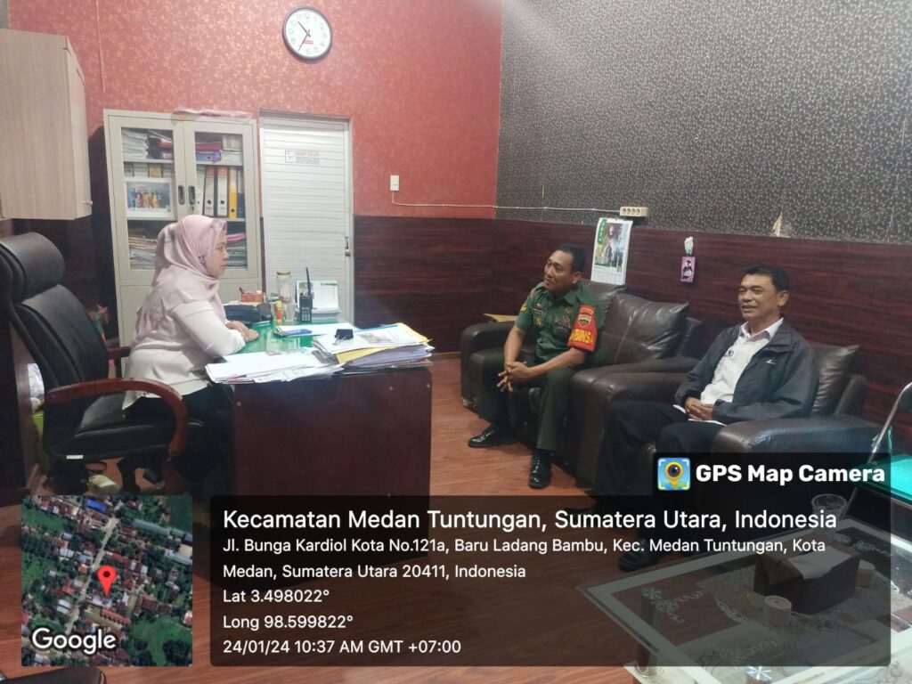 Medan Tuntungan, Sertu JM Sijabat Babinsa kelurahan Baru Ladang Bambu kecamatan Medan Tuntungan sebagai aparat komando kewilayahan yang setiap hari nya bergaul dengan warga di wilayah binaan nya kali ini melaksanakan komsos dengan aparatur di kelurahan lingkungan 4 jalan bunga Pariama, Rabu (24/1/2024).