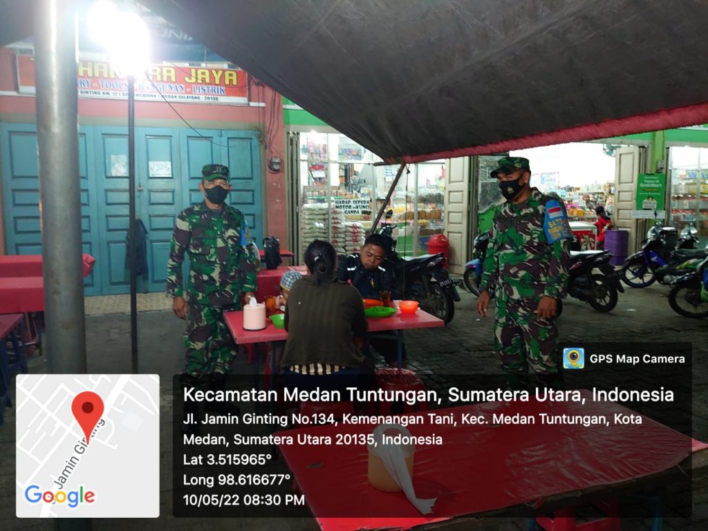 Koramil 07/Medan tuntungan Pelda Jumali dan Sertu Kasno Zeky melaksanakan PPKM Skala Mikro di Swalayan Indomaret, Swalayan Alfamidi, Swalayan Bahagia, Ponsel HAQ dan Ayam Penyet di jalan Jamin Ginting Kelurahan Kemenangan Tani Kecamatan Medan Tuntungan. Selasa (10/5/2022)