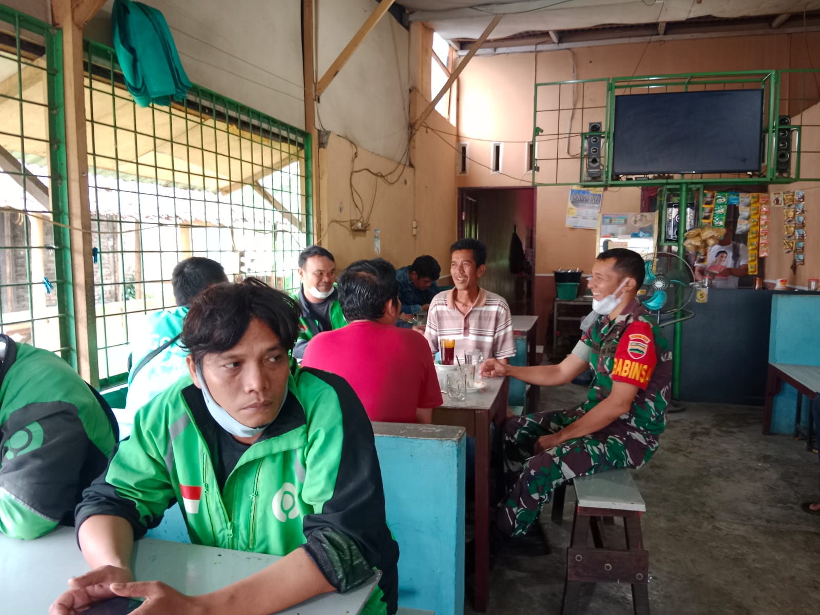 Babinsa Koramil 0201-08/MA Kodim 0201/Medan Kopda Laston Sijabat melaksanakan Komunikasi Sosial (Komsos) bersama para pengemudi Ojek Online (Ojol) di sebuah warung makan tempatnya di Jalan Pintu Air IV, Kelurahan Kwala Bekala, Kecamatan Medan Johor, Selasa (15/11/2022).