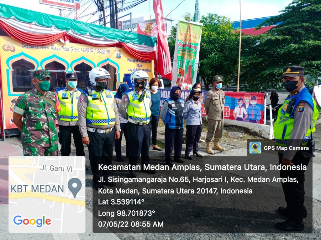 Babinsa Koramil 0201-08/Ma Pelda Widodo dan Kopda L Sijabat melaksanakan apel pagi Pos Pam Lebaran 1443 H Tahun 2022 di simpang tiga depan swalayan Indogrosir , Kecamatan Medan Amplas, Sabtu (07/05/2022).