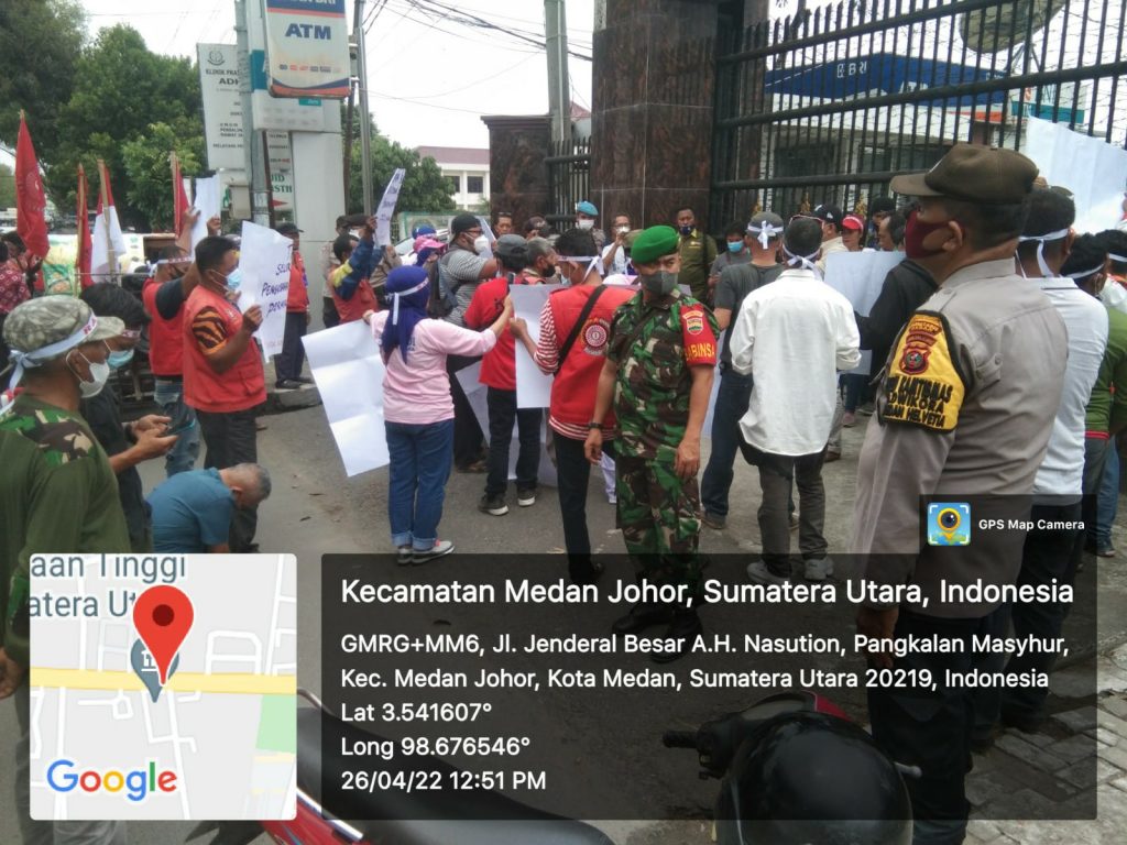 Babinsa Koramil 0201-08/Ma Serka Sitopu monitor berlangsung Aksi Unjuk Rasa yang dilakukan oleh Aliansi Raksahum (Rakyat Untuk Keadilan Supermasi Hukum ) bertempat di Kejatisu Jalan. AH. Nasution, Kelurahan Pangkalan Mansyur , Kecamatan Medan Johor. Selasa (26/4/2022)