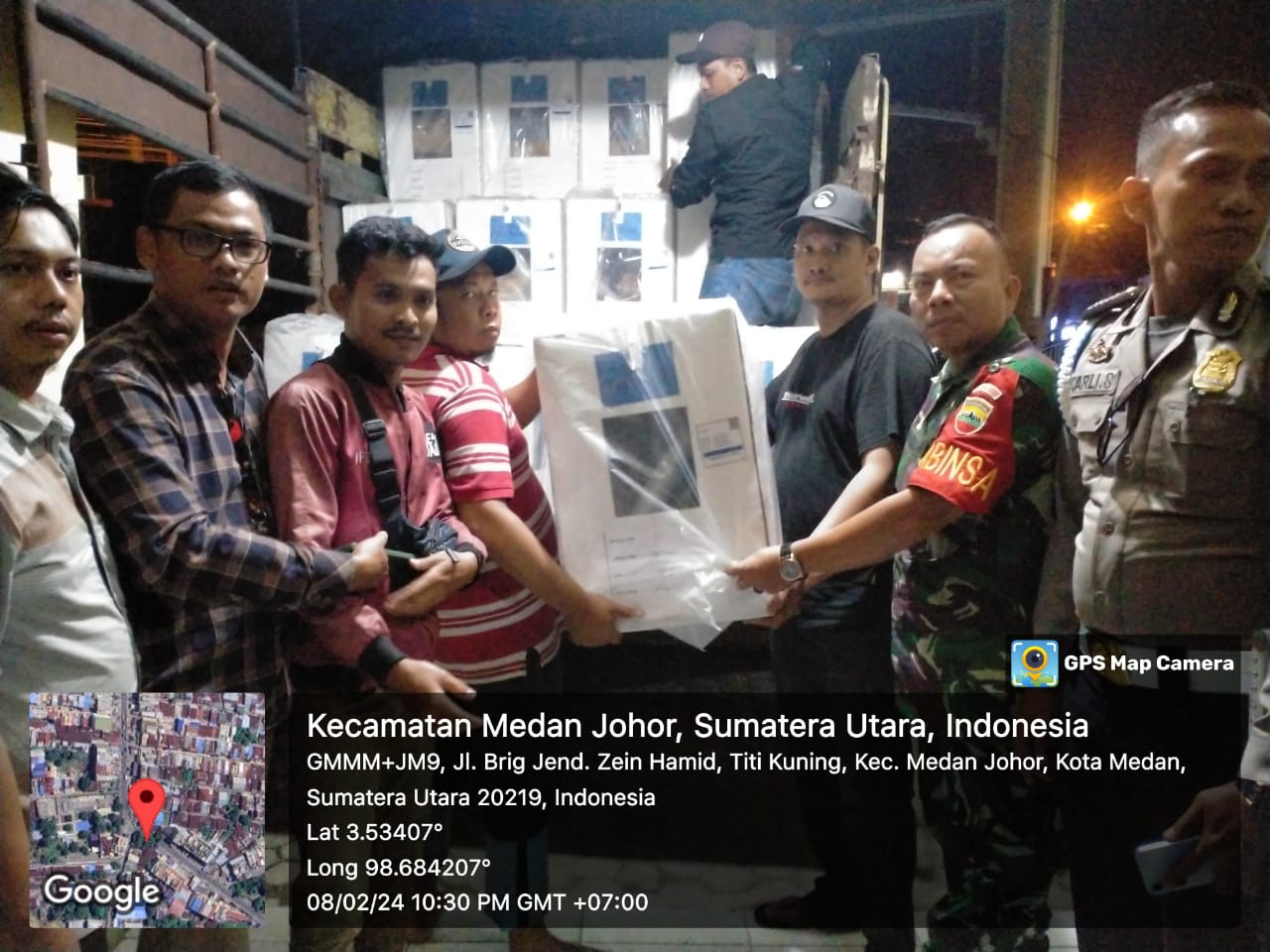 Pastikan tahapan Pemilu 2024 berjalan aman dan lancar, Babinsa Koramil 0201-08/MA jajaran Kodim 0201/Medan Peltu Amin Hasibuan dan Koptu Ridwan Bersama Bhabinkamtibmas dan Lurah beserta Jajarannya Monitoring Kedatangan Logistik Pemilu 2024.