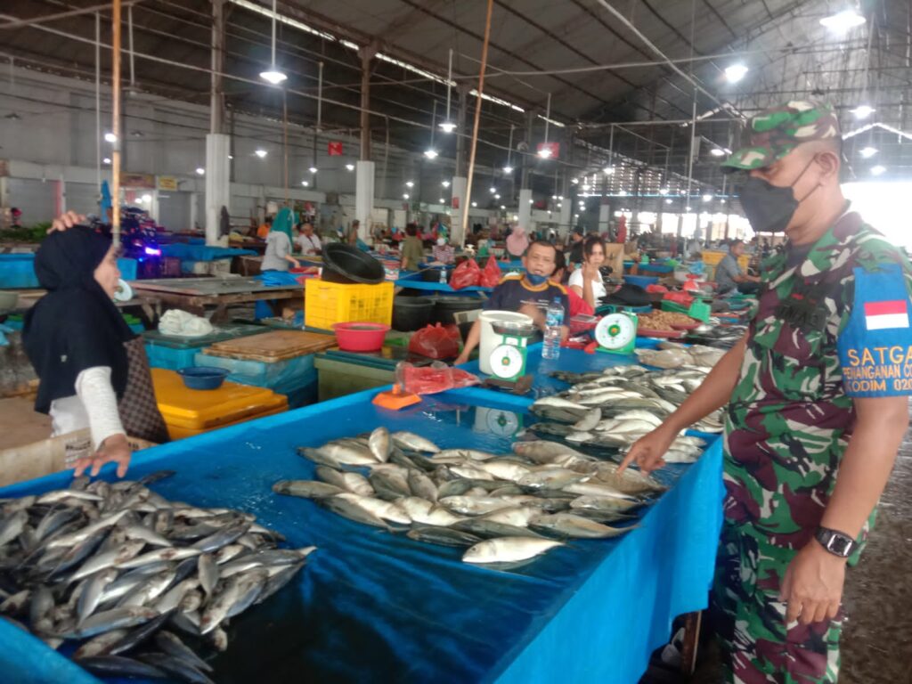 Cegah penularan Covid-19, Babinsa Koramil 0201-08/MA Jajaran Kodim 0201/Medan tetap laksanakan pemanantauan penerapan Protokol Kesehatan (Prokes) di Pasar Baru Simpang Limun Medan Jalan Seksama, Kelurahan Sitirejo III, Kecamatan Medan Amplas, Minggu (20/11/2022).