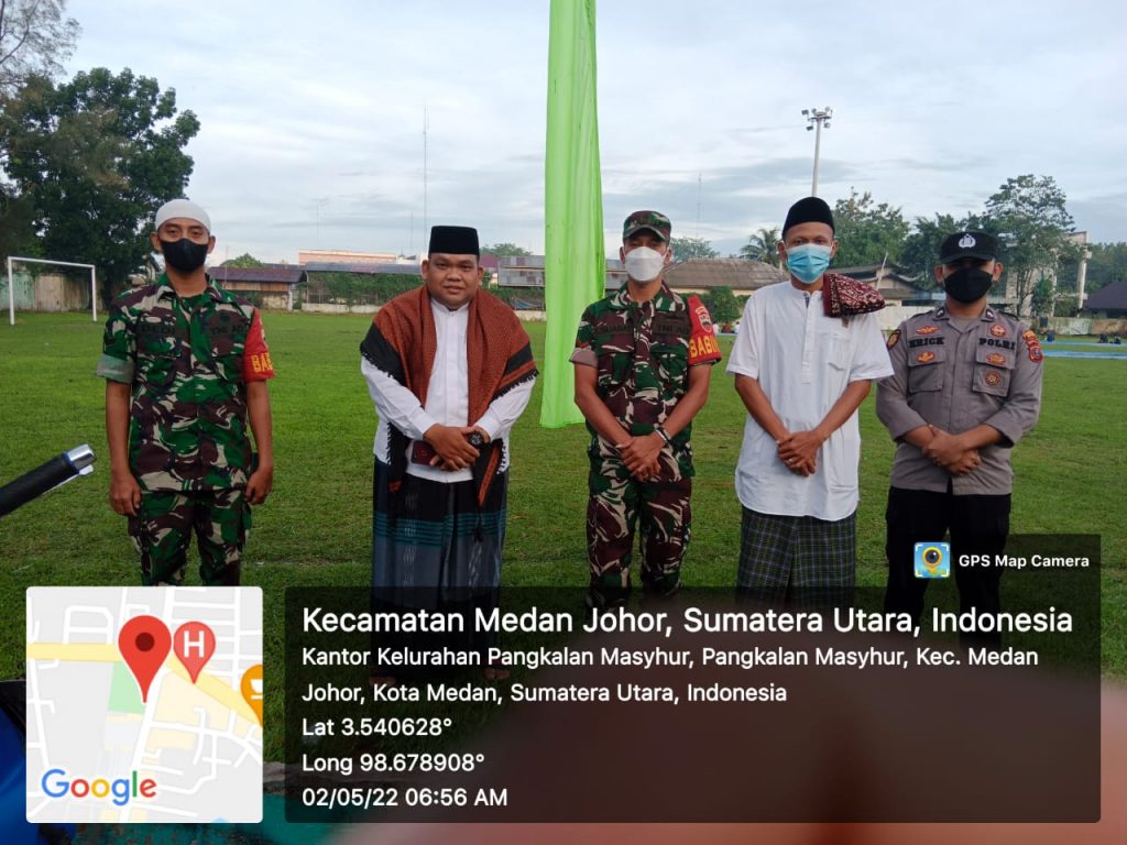 Pastikan kegiatan aman dan tertib Babinsa Koramil 0201-08/Ma Sertu Dedi dan Kopda L Sijabat memantau pelaksanaan kegiatan ibadah sholat idul fitri 1443 H Tahun 2022 bertempat di Lapangan Sejati Jalan Karya Jaya , Kelurahan Pangkalan Mansyur , Kecamatan Medan Johor. Senin (02/05/2022).