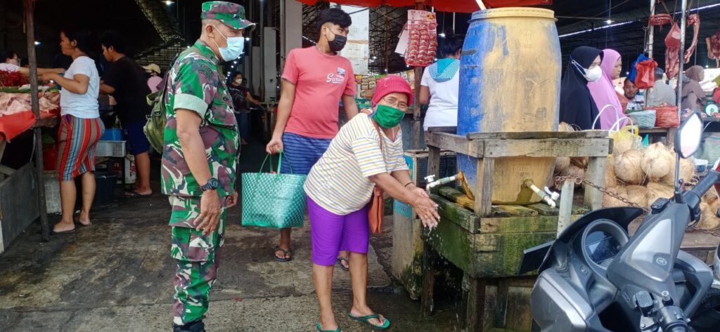MEDAN – Dukung program pemerintah dalam penanganan Covid-19, Babinsa Koramil 0201-08/MA Kodim 0201/Medan Pelda Widodo dan Serma Rudi Hartono melaksanakan pemantauan prokes di Pasar Baru Simpang Limun Medan, Jalan Seksama, Kelurahan Sitirejo III, Kecamatan Medan Amplas, Kamis (29/09/2032).