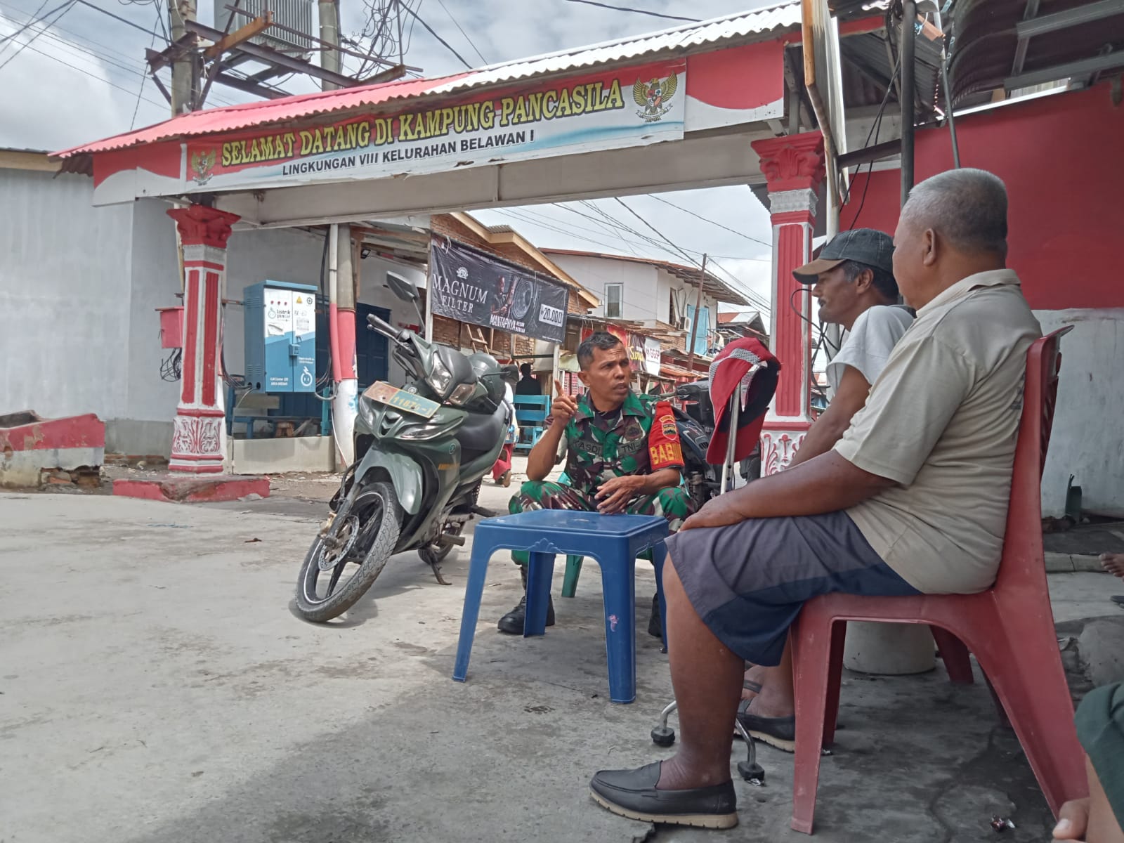 Medan Belawan ~ Serma Kasdi Babinsa Koramil 0201-09/MB Kodim 0201/Medan melaksanakan komsos bersama sesepuh warga Kampung Pancasila lingkungan II Kelurahan Belawan Satu Kecamatan Medan Belawan,Sabtu(1/10/22).