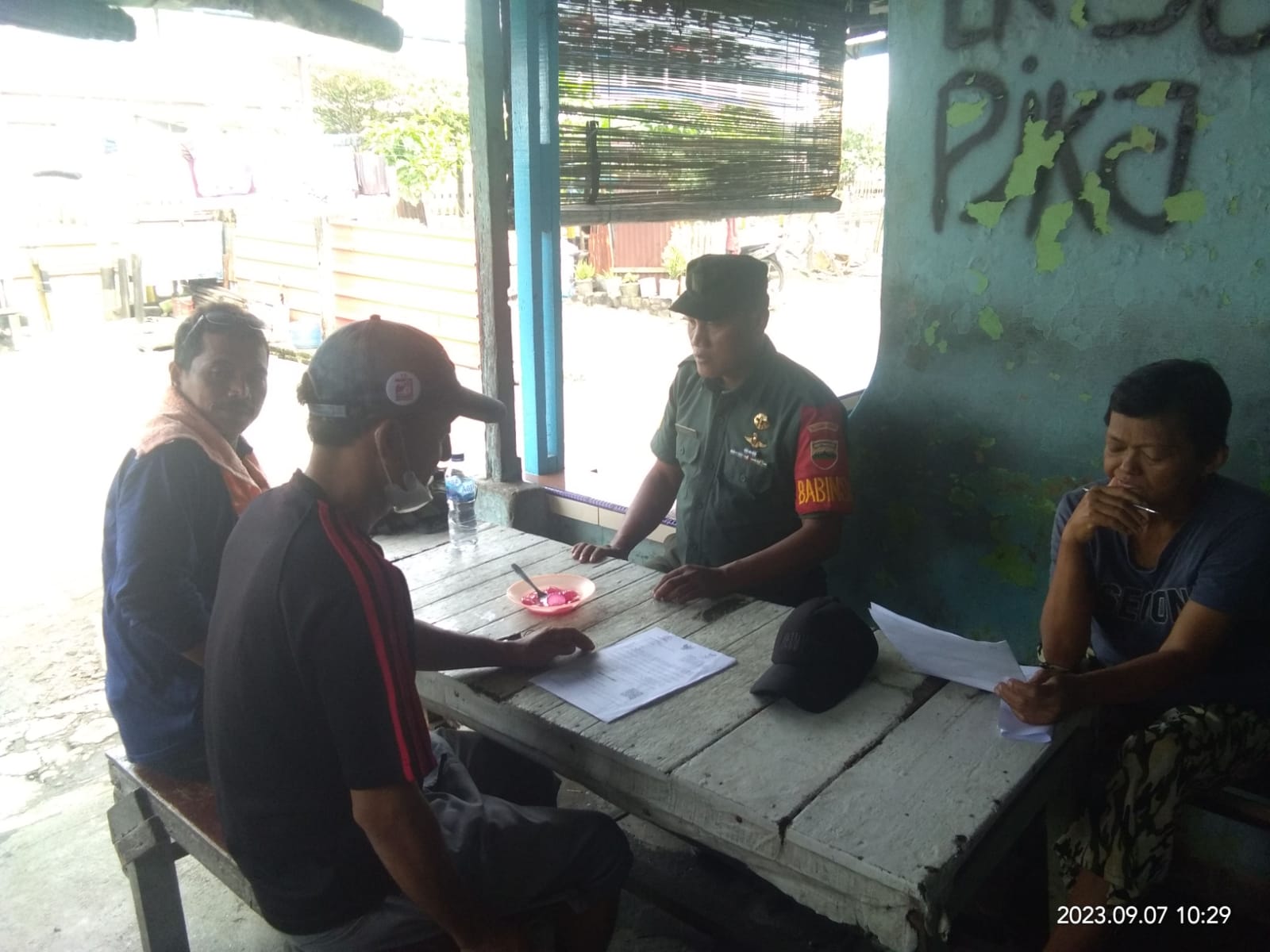 Belawan ~ Serma Suwardi Babinsa Koramil 0201-09/MB Kodim 0201/Medan melaksanakan Kegiatan Komunikasi Sosial(Komsos) bersama warga binaan bertempat di Jl.PJKA lingkungan 38 Kelurahan Belawan II Kecamatan Medan Belawan, Kamis(07/09/23).