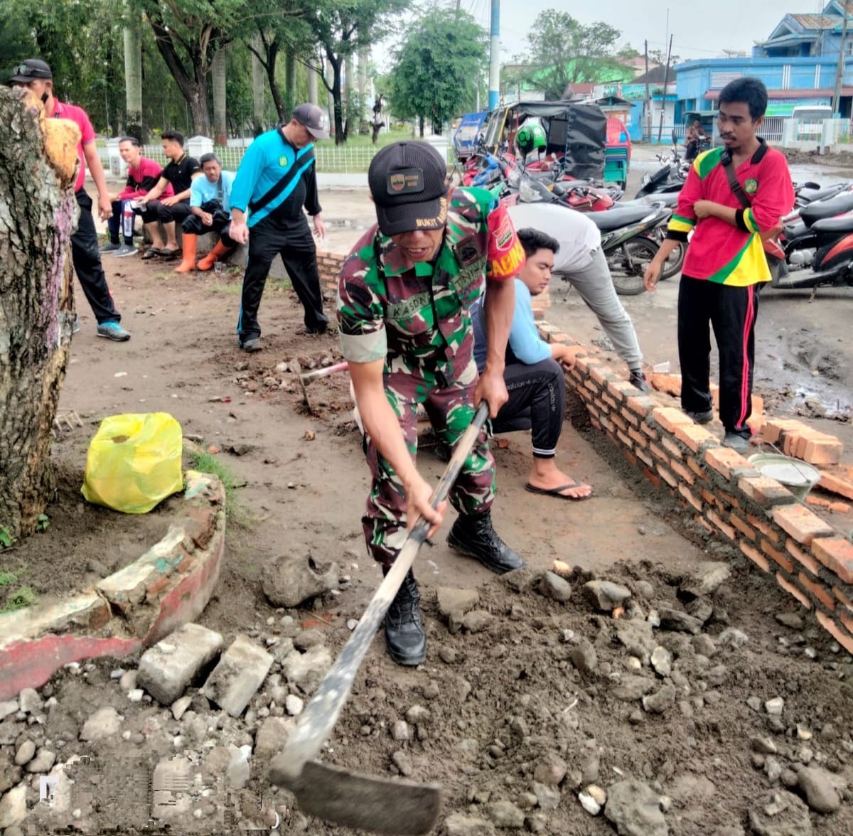 Babinsa Belasan Satu Serma Kasdi bersama kepala lingkungan bekerja sama membantu pelaksanaan pembangunan taman kota Belawan yang terletak di simpang pompa yang merupakan pusat kota dimana keindahan dan kenyamanannya harus tetap terjaga.