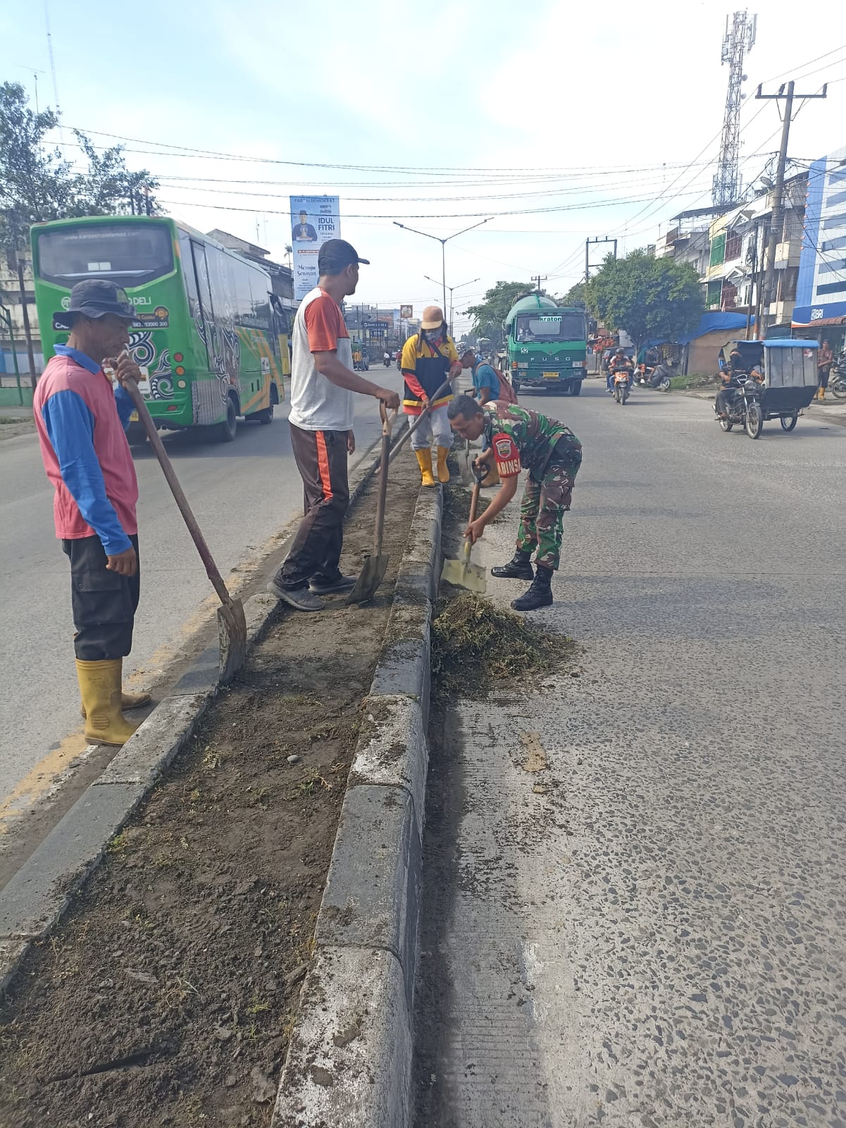 Medan – Babinsa Koramil 0201-10/MM Kodim 0201/Medan Sertu Adi Erlan bersama warga masyarakat dan P3SU melaksanakan kegiatan gotong royong di sepanjang jalan Kom Yos Sudarso lingkungan 6 simpang kantor kelurahan martubung kecamatan Medan labuhan, Kamis (01/06/2023)