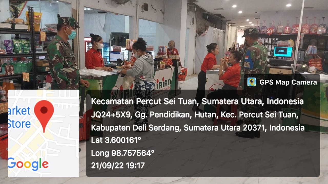 Percut Sei Tuan. Sebanyak dua orang Babinsa Koramil 0201-13/PST Serma Heriyandi Siko dan Serda Jaya Gultom pada hari Rabu 21 September 2022 menghimbau pengunjung dan Karyawan agar selalu mematuhi Prokes bertempat di Swalayan Irian Jln Besar Medan Batang Kuis Desa Bandar Klippa Kecamatan Percut Sei Tuan