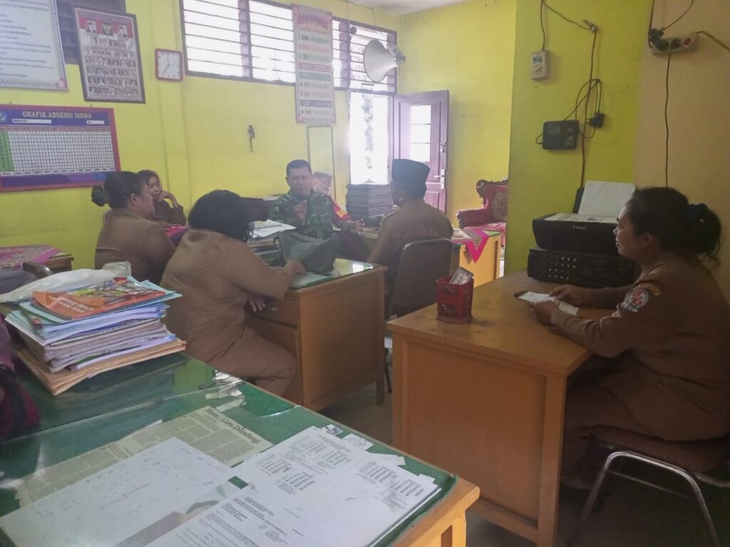 Tanjung Morawa – Serka B.Prayitno Babinsa Koramil 0201-16/TM Kodim 0201/Medan melaksanakan Komsos dengan Bpk Drs Anwar, Kepala Sekolah SDN 101876 jln Ibnu Khattab dusun 3 Desa Tanjung Morawa B Kecamatan Tanjung Morawa ,Senin (07/11/22).