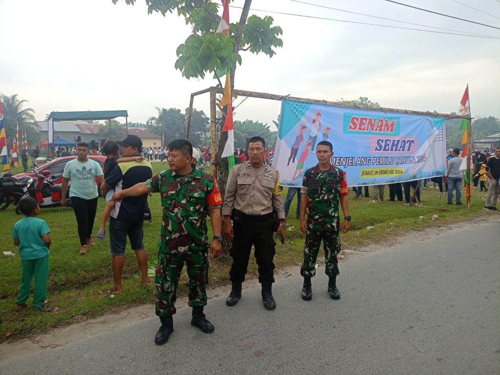 Tanjung Morawa, Babinsa Koramil 0201-16/Tanjung Morawa Serka Rohmad dan sertu Toto Yudiono bersama Bhabinkamtibmas memonitoring kegiatan senam bersama Dalam rangka menyambut Pemilu tahun 2024 di lapangan sepak bola Desa Dalu XB, Kec. Tanjung Morawa Kab. Deli Serdang Jumat (09-02-2024).
