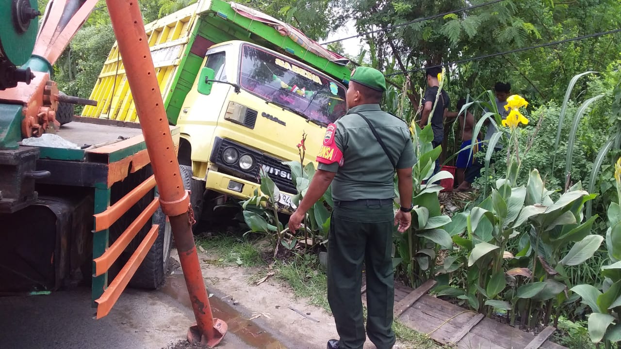 Tanjung Morawa- Anggota Bintara Pembina Desa (Babinsa)Komando Rayon Militer (Koramil) ,Babinsa Koramil 0201-16/TM Kodim 0201/Medan,membantu warga mengevakuasi kendaraan jenis truck MITSUBISHI yang mengalami kecalakaan di jalan Trans Tanjung Morawa-Medan Kilometer 21 Dusun lll Desa Tanjung Baru Kec Tanjung Morawa Kab Deli Serdang, Selasa(12/9/2023).
