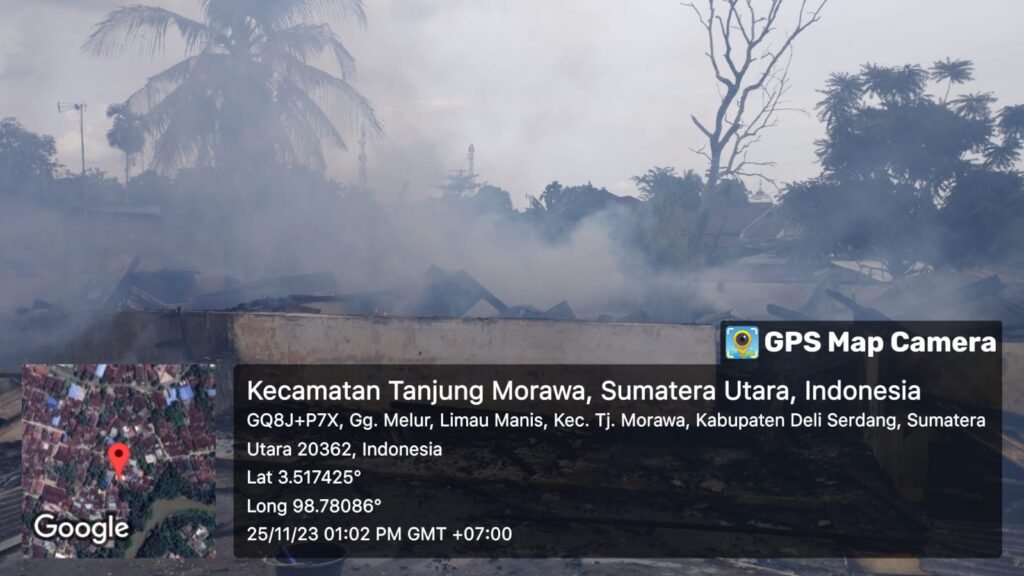 Tanjung Morawa,Babinsa Koramil 0201-16/TM Kodim 0201/Medan,Serda D.S.Barus Memonitor kebakaran rumah Couple Semi permanen di Kandang Lembu Gg.Teratai Dusun III A Desa Limau Manis Kecamatan Tanjung Morawa Kabupaten Deli Serdang, Sabtu 25 November 2023.