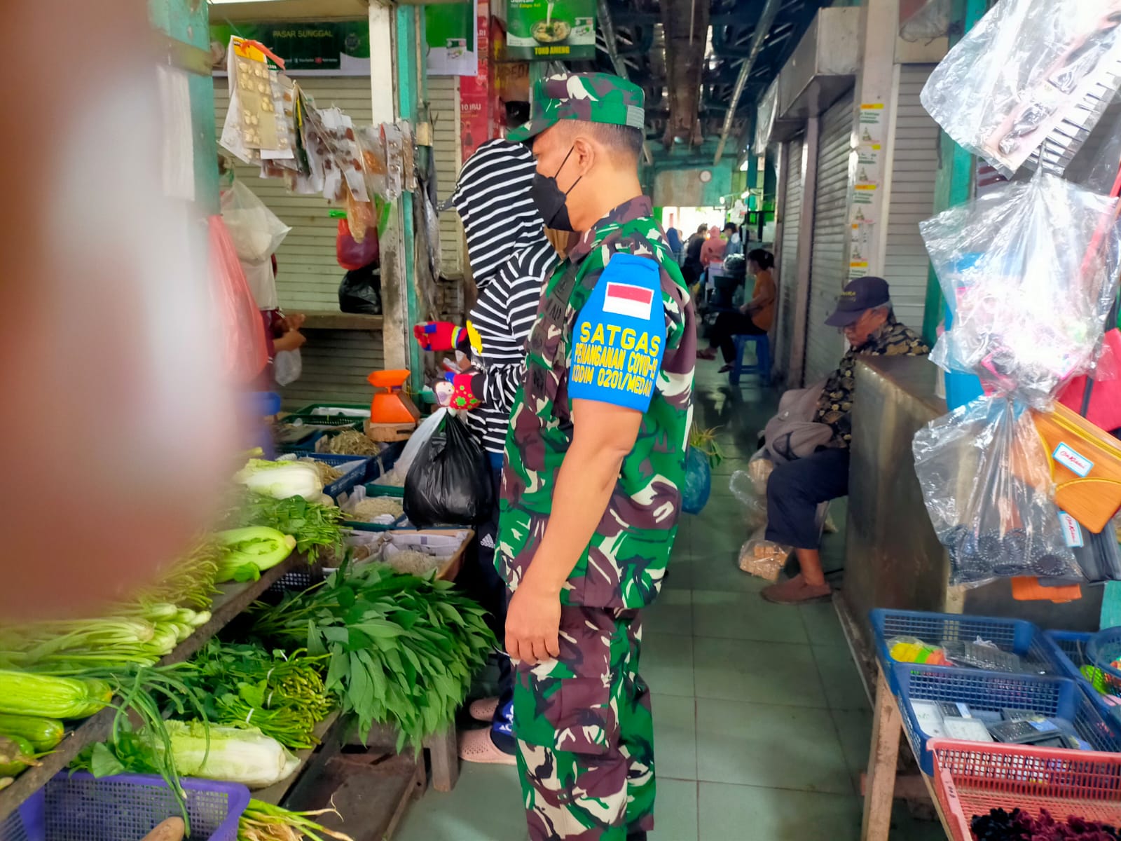 Medan Sunggal,Babinsa Koramil 0201-06/MS An.Sertu Rokim Terus Lakukan PPKM Di Pajak Sunggal Yg Mana Tempat Tersebut Tempat Terjadinya Antara Pedagang dan Konsumen Tempat Transaksi Jual Beli Untuk Kebutuhan Sehari Masyarakat Salah Satunya Kelurahan Sunggal Kecamatan Mdn Sunggal.Sabtu,24/09/22
