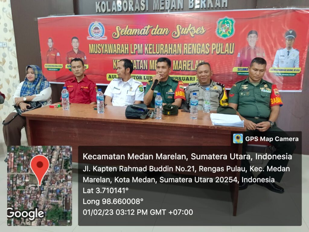 Medan Marelan – Babinsa Kel Rengas Pulau, Koramil 0201-10/MM Kodim 0201/Medan, bertempat di aula Kel. Rengas Pulau menghadiri kegiatan rapat musyawarah pemilihan ketua LPM Kel Rengas Pulau tahun 2023 . Rabu (1/2/2023)