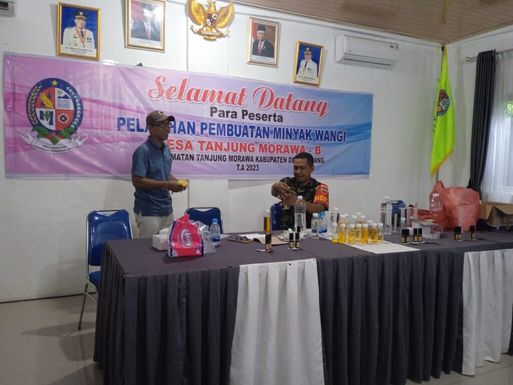 Tanjung Morawa,Bertempat di Aula kantor Desa Tanjung Morawa B, Babinsa Koramil 0201-16/TM Serka Susanto Bersama Karang Taruna bpk Pitri memberikan pelatihan peracikan minyak wangi di wilayah binaan.( Jumat, 15 Des 2023 )