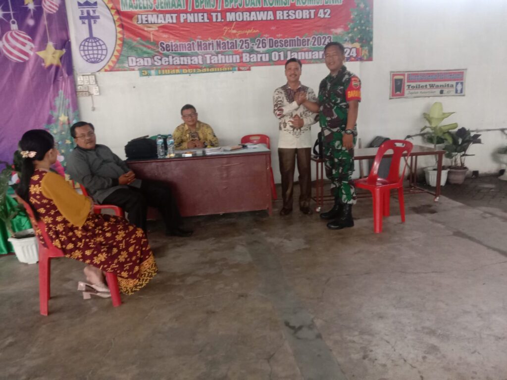 TANJUNG MORAWA – Anggota Koramil 0201-16/TM Serda Suyitno monitoring kegiatan Ibadah Natal di Gereja Banua Niha Keriso Protestan( BNKP ) PNIEL desa limau manis kecamatan Tanjung morawa kabupaten Deli Serdang , Minggu, (24/12/2023).