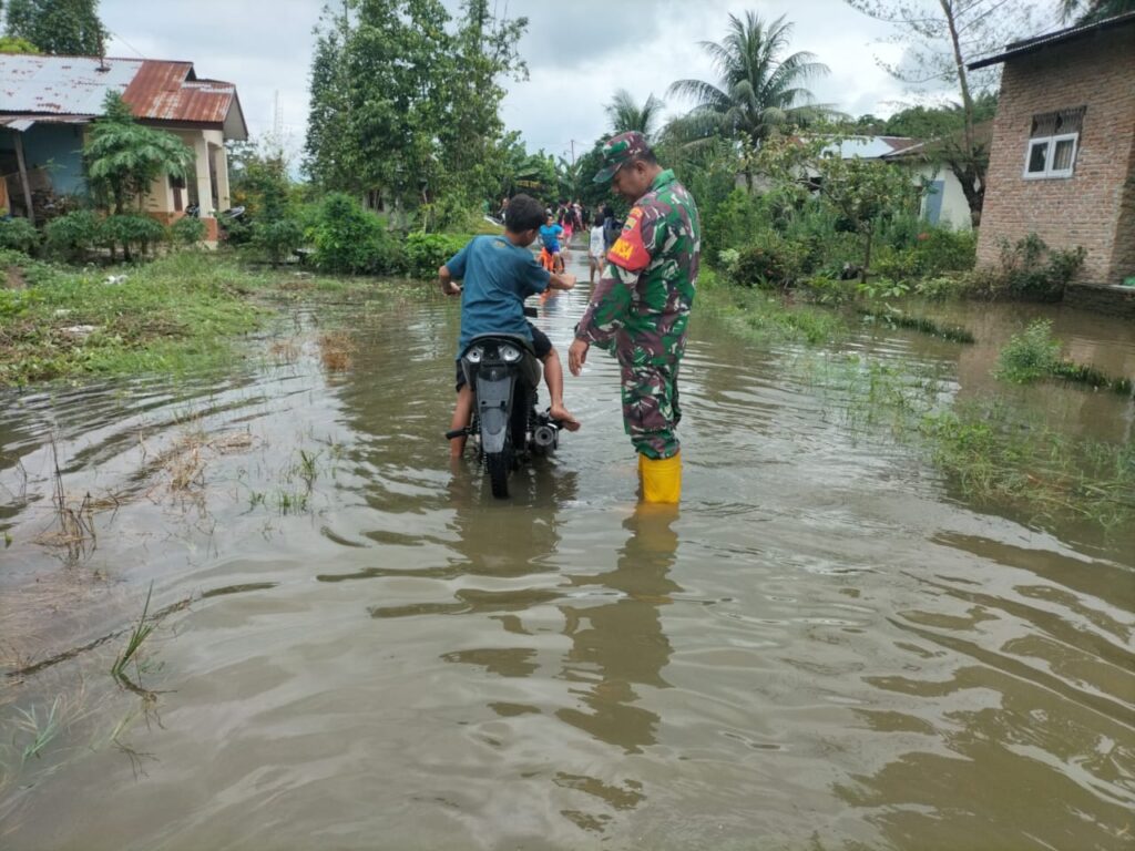 Babinsa memonitoring banjir yang terjadi akibat curah hujan semalam mengakibatkan Dusun 6 Desa Dalu 10 B Kecamatan Tanjung Morawa jalan impres teredam banjir