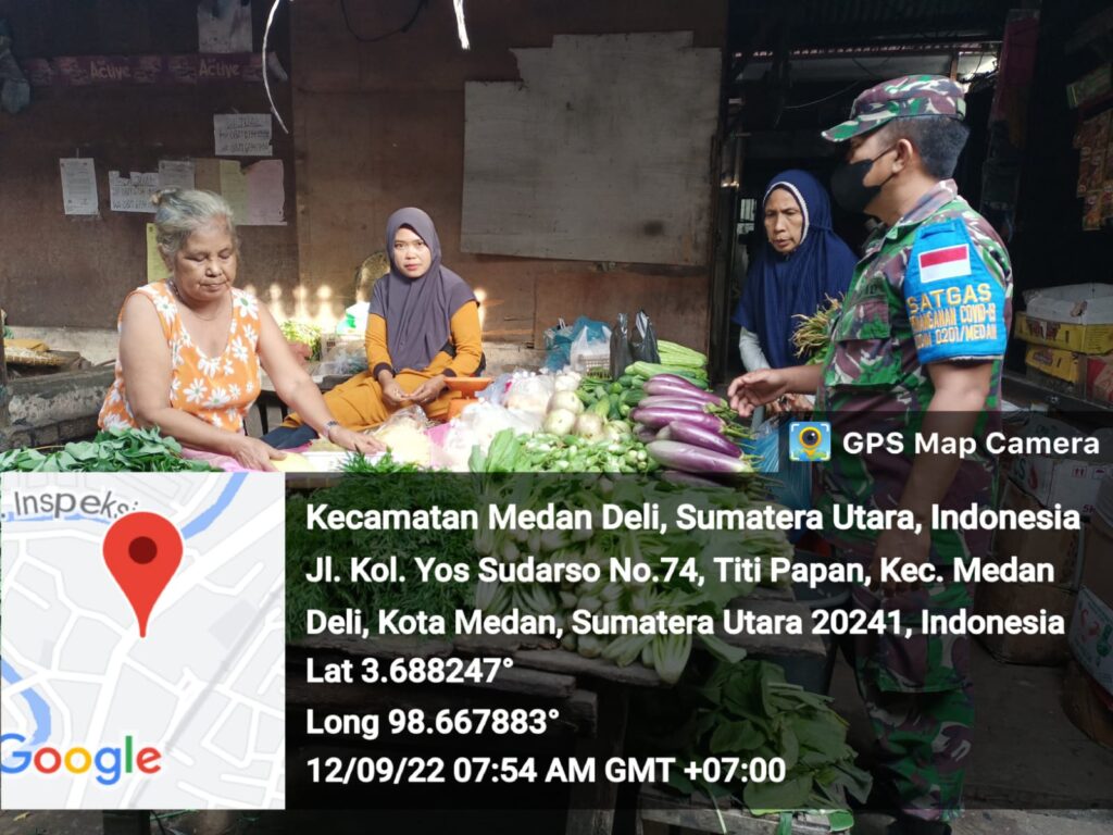 Babinsa dengan kegiatan sehari-hari nya berbaur dengan masyarakat merupakan ujung tombak TNI AD dalam memutus mata rantai Covid 19, peran tersebut diaplikasikan di salah satu pusat kerumunan tepatnya di pasar sadar jln. Yos Sudarso Kel. Titipapan kec. Medan deli Senin, (12/09/2022).