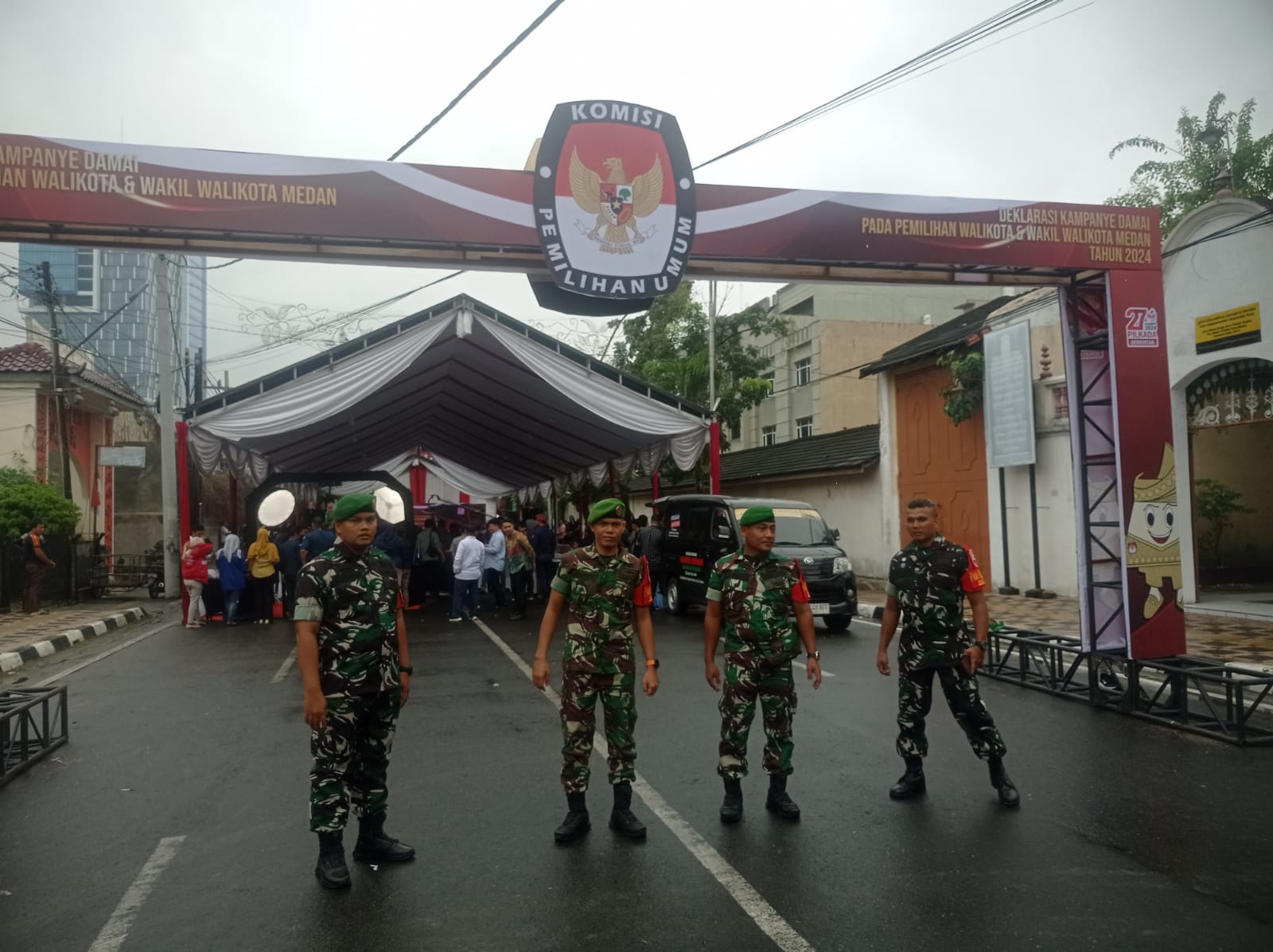 Babinsa Petisah Tengah Serda Rajoki Siregar monitoring pelaksanaan penyampaian visi misi dan penandatanganan Deklarasi Kampanye Damai Pilkada Kota Medan Tahun 2024 di Halaman Kantor KPU Kota Medan Jln. Kejaksaan Kelurahan Petisah Tengah Kecamatan Medan Petisah, Selasa, 24 September 2024.
