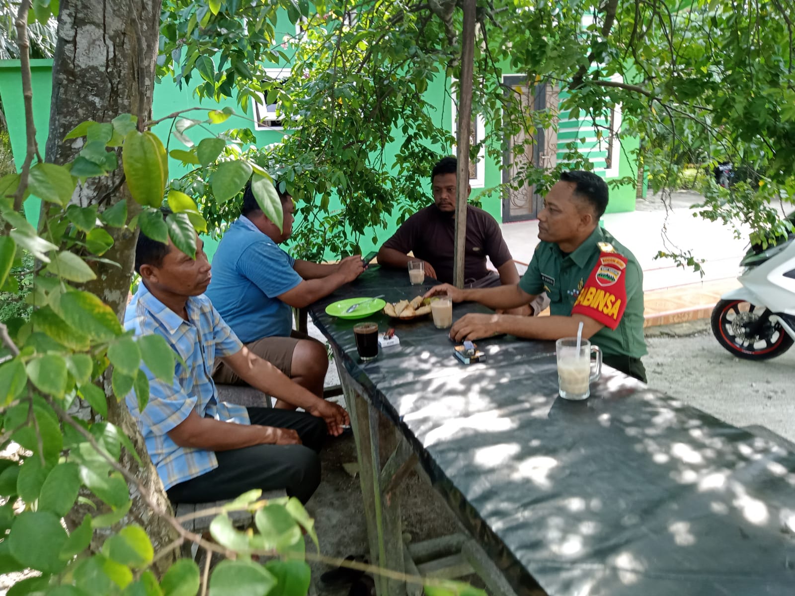 Percut Sei Tuan. Babinsa Koramil 0201-13/PST Desa Tanjung Rejo Peltu Adi Syahputra melaksanakan Komsos di halaman rumah saudara Bandot selaku Tokoh Masyarakat bersama warga Dusun 14 Paloh 80 Desa Tanjung Rejo, Kamis (30/11/23).