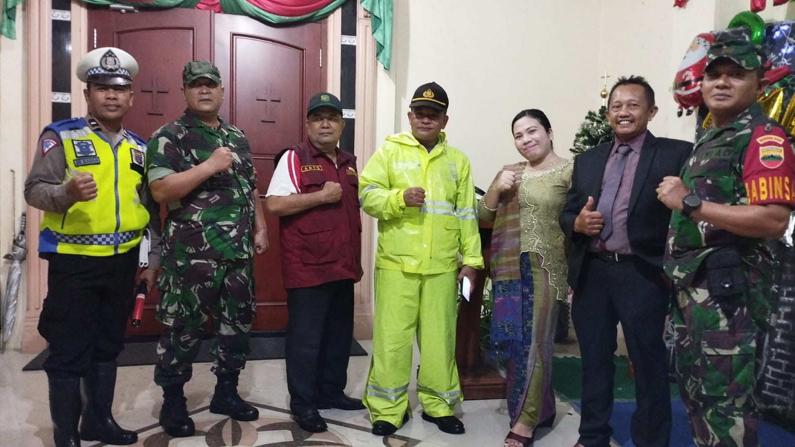 Medan : Guna memberikan kenyamanan bagi umat kristiani yang akan melaksanakan ibadah malam Natal tahun 2023, Babinsa Koramil 0201-08/MA Kodim 0201/Medan bersama Personil Polsek Patumbak dan Aparatur Kelurahan melaksanakan Pengamanan di Gereja Wilayah Kelurahan Sitirejo III, Kecamatan Medan Amplas, Minggu 24 Deseber 2023, malam.
