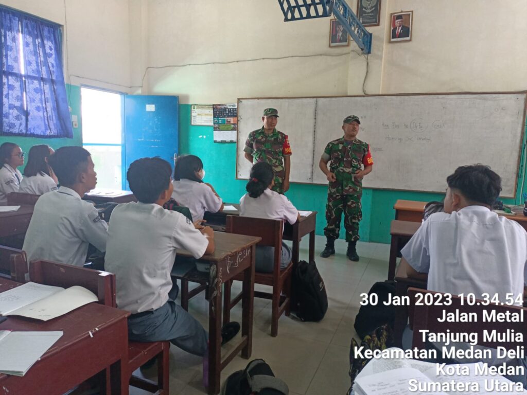 Medan – Dalam rangka membangkitkan minat pelajar menjadi anggota TNI, Babinsa Koramil 0201-11/MD, Kodim 0201/Medan,Babinsa Sertu Rudi Apriyanto dan Serda Sukirman melaksanakan sosialisasi penerimaan prajurit ke sekolah – sekolah di wilayah binaan masing-masing seperti di SMA Swasta Yayasan Perguruan Hosana di Jl.Metal Tanjung Mulia, Kecamatan Medan Deli. Senin (30/01/2023).